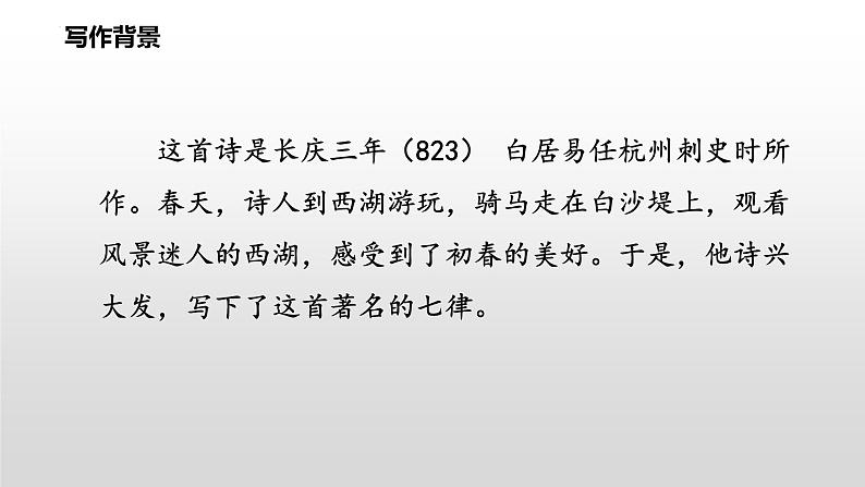 这首诗是长庆三年(823) 白居易任杭州刺史时所作。春天,诗人到西湖游玩,骑马走在白沙堤上,观看风景迷人的西湖,感受到了初春的美好。于是,他诗兴大发,写下了这首著名的七律。