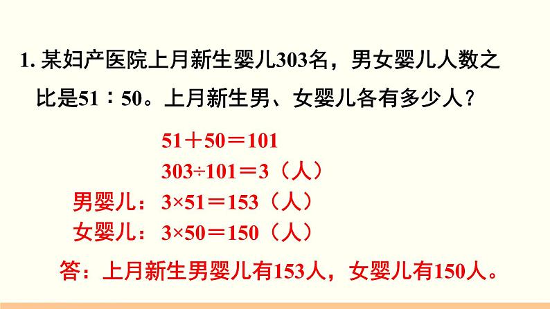展开1. 某妇产医院上月新生婴儿303名,男女婴儿人数之 比是51︰50。上月新生男、女婴儿各有多少人?