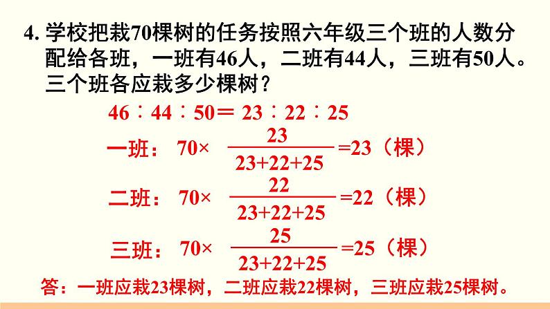 4. 学校把栽70棵树的任务按照六年级三个班的人数分 配给各班,一班有46人,二班有44人,三班有50人。 三个班各应栽多少棵树?