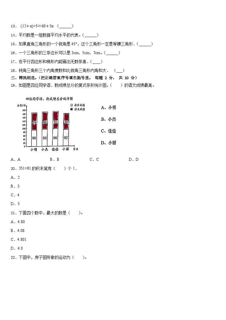 19.如图是四位同学语、数成绩总分的复式条形统计图,( )的语文成绩最高。