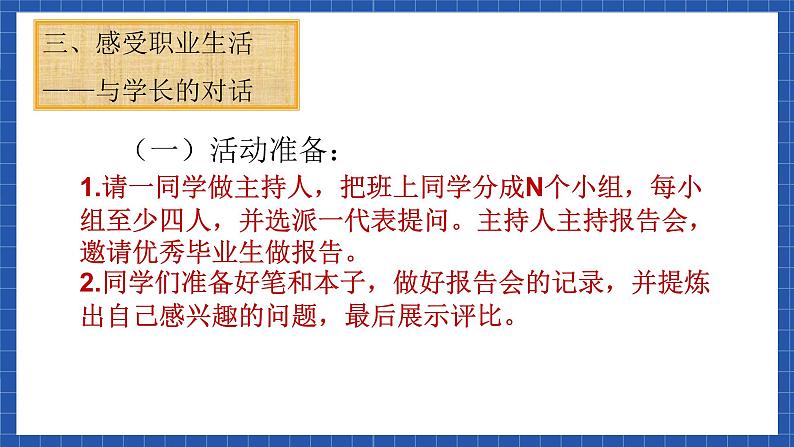 1.请一同学做主持人,把班上同学分成N个小组,每小组至少四人,并选派一代表提问。主持人主持报告会,邀请优秀毕业生做报告。2.同学们准备好笔和本子,做好报告会的记录,并提炼出自己感兴趣的问题,最后展示评比。