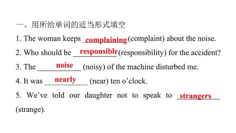 一、用所给单词的适当形式填空1. The wman keeps ___________ (cmplaint) abut the nise. 2. Wh shuld be ___________ (respnsibility) fr the accident?3. The ___________ (nisy) f the machine disturbed me. 4. It was ___________ (near) ten ’clck. 5. We’ve tld ur daughter nt t speak t ___________ (strange).