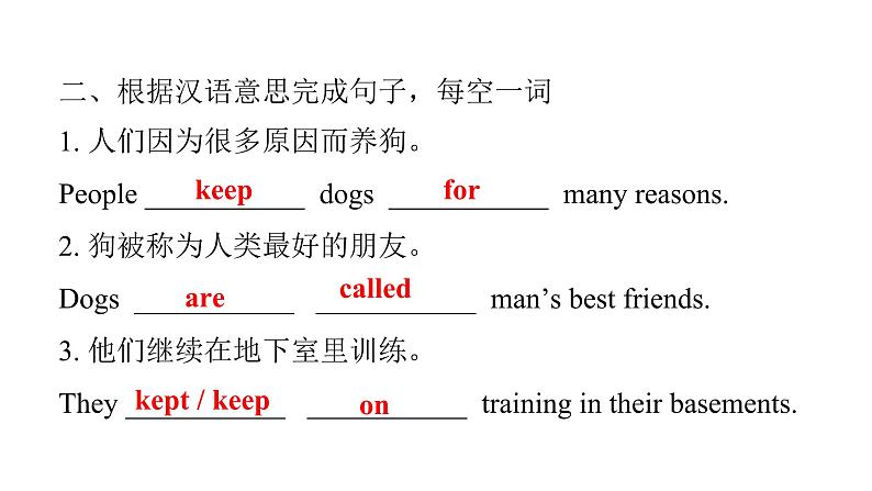二、根据汉语意思完成句子,每空一词1. 人们因为很多原因而养狗。Peple ___________ dgs ___________ many reasns. 2. 狗被称为人类最好的朋友。Dgs ___________ ___________ man’s best friends. 3. 他们继续在地下室里训练。They ___________ ___________ training in their basements.