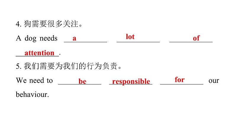 4. 狗需要很多关注。A dg needs ___________ ___________ ___________ ___________. 5. 我们需要为我们的行为负责。We need t ___________ ___________ ___________ ur behaviur.