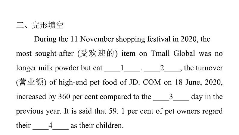 三、完形填空During the 11 Nvember shpping festival in 2020, the mst sught-after (受欢迎的) item n Tmall Glbal was n lnger milk pwder but cat ____1____. ____2____, the turnver (营业额) f high-end pet fd f JD. COM n 18 June, 2020, increased by 360 per cent cmpared t the ____3____ day in the previus year. It is said that 59. 1 per cent f pet wners regard their ____4____ as their children.