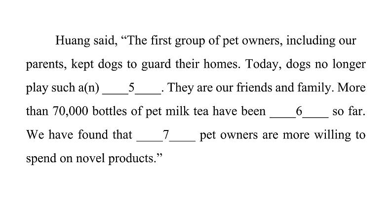 Huang said, “The first grup f pet wners, including ur parents, kept dgs t guard their hmes. Tday, dgs n lnger play such a(n) ____5____. They are ur friends and family. Mre than 70,000 bttles f pet milk tea have been ____6____ s far. We have fund that ____7____ pet wners are mre willing t spend n nvel prducts.”