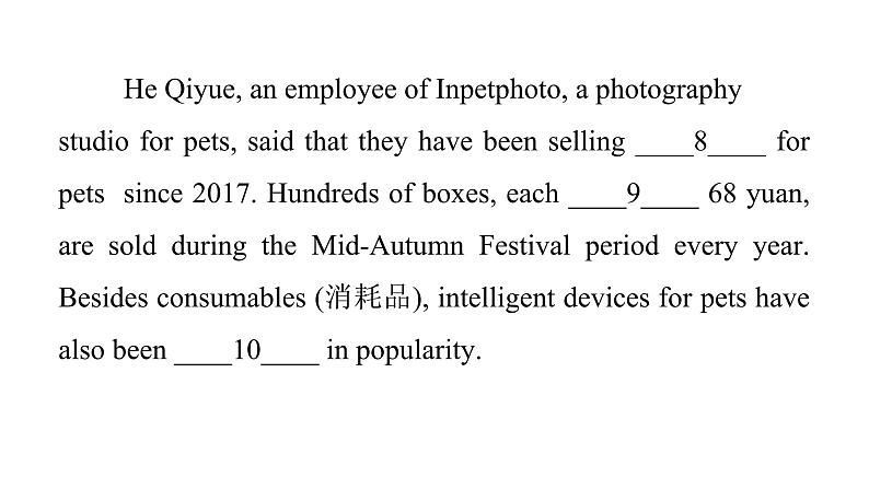 He Qiyue, an emplyee f Inpetpht, a phtgraphy studi fr pets, said that they have been selling ____8____ fr pets since 2017. Hundreds f bxes, each ____9____ 68 yuan, are sld during the Mid-Autumn Festival perid every year. Besides cnsumables (消耗品), intelligent devices fr pets have als been ____10____ in ppularity.