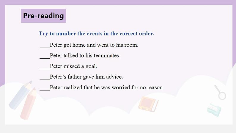 _____ Peter gt hme and went t his rm._____ Peter talked t his teammates._____ Peter missed a gal._____ Peter’s father gave him advice._____ Peter realized that he was wrried fr n reasn.