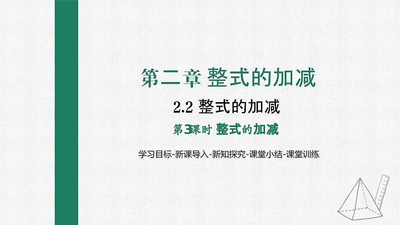 初中数学第二章 整式的加减2.2 整式的加减图片ppt课件: 这是一份初中数学第二章 整式的加减2.2 整式的加减图片ppt课件,共14页。PPT课件主要包含了新课导入,导入课题,学习目标,推进新课,知识点1,整式的加减,例6计算,7x+y,4a–2b,7a2–3ab等内容,欢迎下载使用。