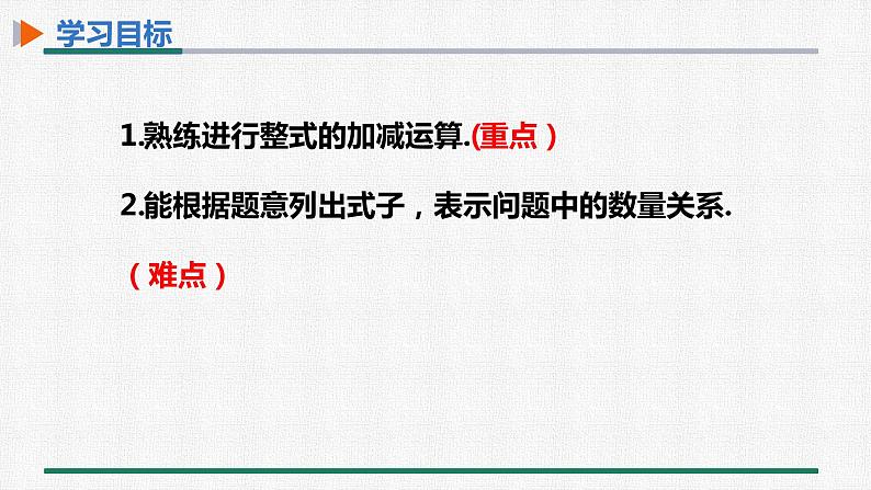 展开1.熟练进行整式的加减运算.(重点)2.能根据题意列出式子,表示问题中的数量关系.(难点)