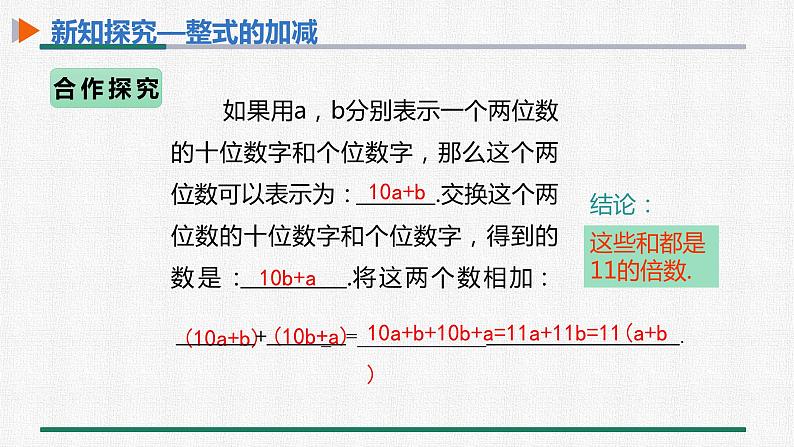 如果用a,b分别表示一个两位数的十位数字和个位数字,那么这个两位数可以表示为: .交换这个两位数的十位数字和个位数字,得到的数是: .将这两个数相加: