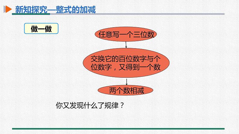 人教版七年级上册2.2 整式的加减图片课件ppt: 这是一份人教版七年级上册2.2 整式的加减图片课件ppt,共16页。PPT课件主要包含了新课引入,合作探究,生活展现,提炼总结,试一试,有括号,归纳小结,强化训练,先化简再求值等内容,欢迎下载使用。