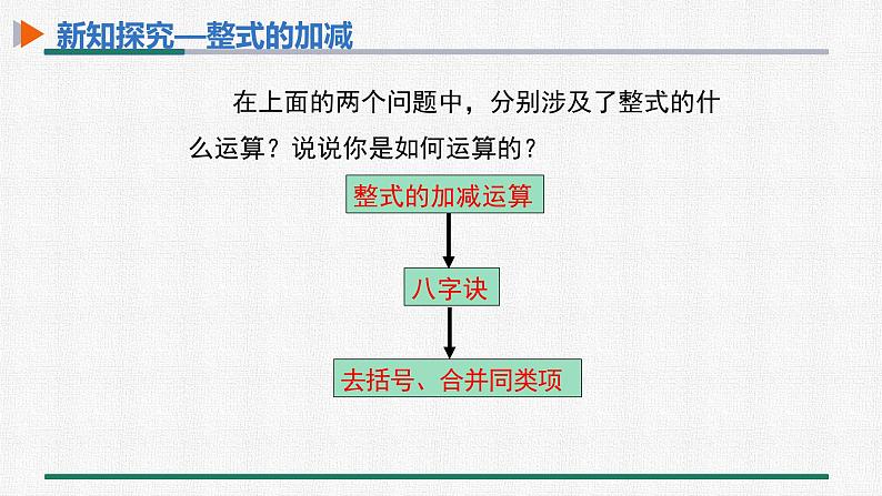 1.几个整式相加减,通常用括号把每一个整式括起来,再用加、减连接,然后进行运算.
