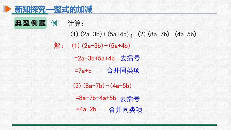 例1 计算: (1)(2a-3b)+(5a+4b);(2)(8a-7b)-(4a-5b)
