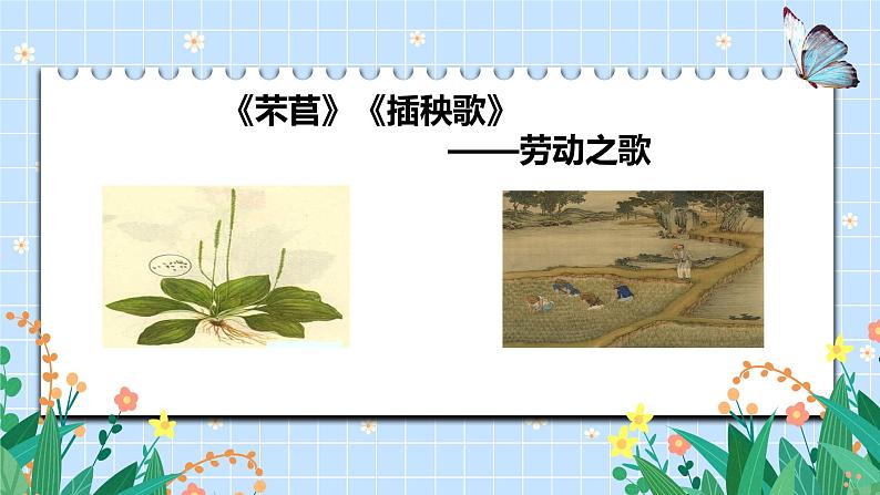 这是一份高中语文第二单元6 (芣苢 插秧歌)6.1 芣苢完美版课件ppt,共30页。PPT课件主要包含了感受诗意,共同主题田间劳作,体悟诗境,体味诗情,深味诗旨等内容,欢迎下载使用。