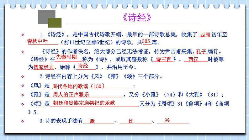 1.《诗经》,是中国古代诗歌开端,最早的一部诗歌总集,收集了 初年至(前11世纪至前6世纪)的诗歌,共篇。 《诗经》的作者佚名,绝大部分已经无法考证,传为尹吉甫采集、编订。《诗经》在 称为《诗》,或取其整数称《 》。时被尊为儒家经典,始称《》,并沿用至今。2.诗经在内容上分为《风》《雅》《颂》三个部分。《风》是;《雅》是 ,又分《小雅》(74)和《大雅》(31);《颂》是 又分为《周颂》31《鲁颂》4和《商颂》5。3.诗的表现手法有、、