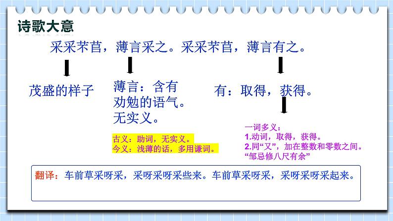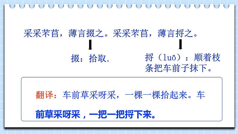 采采芣苢,薄言采之。采采芣苢,薄言有之。 duō luō 采采芣苢,薄言掇之。采采芣苢,薄言捋之。 jié xié采采芣苢,薄言袺之。采采芣苢,薄言襭之。