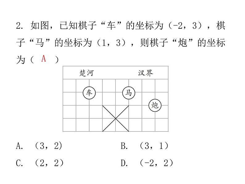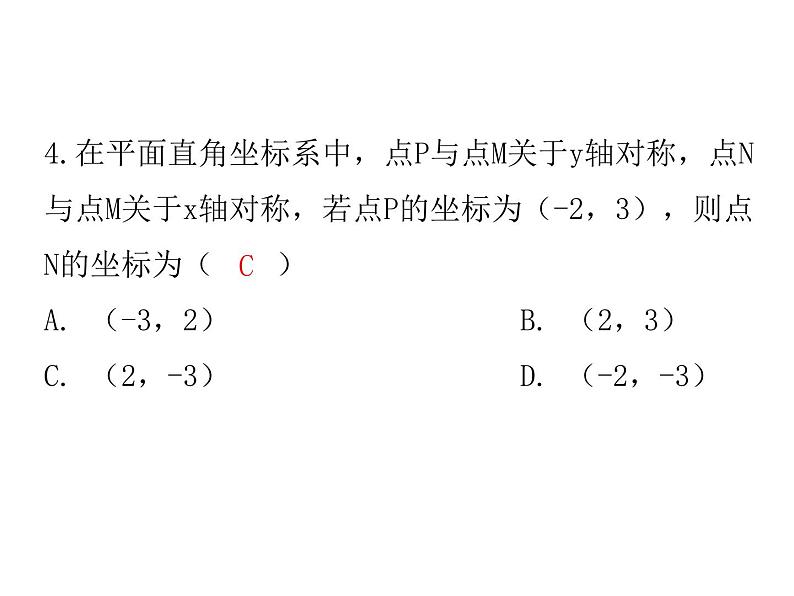 1. 根据下列表述,不能确定具体位置的是( )A. 教室内的3排4列B. 渠江镇胜利街道15号C. 南偏西30°D. 东经108°,北纬53°C2. 如图,已知棋子“车”的坐标为(-2,3),棋子“马”的坐标为(1,3),则棋子“炮”的坐标为( )A. (3,2) B. (3,1) C. (2,2) D. (-2,2)A3. 点M位于平面直角坐标系第四象限,且到x轴的距离是5,到y轴的距离是2,则点M的坐标是( )A. (2,-5) B. (-2,5)C. (5,-2) D. (-5,2)A4.在平面直角坐标系中,点P与点M关于y轴对称,点N与点M关于x轴对称,若点P的坐标为(-2,3),则点N的坐标为( )A. (-3,2) B. (2,3)C. (2,-3) D. (-2,-3)C5. 在平面直角坐标系内,一个点的坐标为(2,-3),则它关于x轴对称的点的坐标是 .(2,3)6. 如图,这是某市部分建筑分布简图,请以火车站的坐标为(-1,2),市场的坐标为(3,5)建立平面直角坐标系,并分别写出超市、体育场和医院的坐标.7. 在平面直角坐标系中,若点P(a,b)关于x轴的对称点在第三象限,则( )A. a>0,b>0 B. a>0,b<0C. a<0,b>0 D. a<0,b<0C8. 如图,小明从家到达学校要穿过一个居民小区,小区的道路均是正南或正东方向,则小明走下列线路不能到达学校的是( )A. (0,4)→(0,0)→(4,0)B. (0,4)→(4,4)→(4,0)C. (0,4)→(3,4)→(4,2)→(4,0)D. (0,4)→(1,4)→(1,1)→(4,1)→(4,0)C9. 如图,若在象棋盘上建立直角坐标系,使“帅”位于点(-1,-2),“马”位于点(2,-2),则“兵”位于点 .(-3,1)10. 若|a-2|+(b-5)2=0,则点P (a,b)关于x轴对称的点的坐标为 .(2,-5)11. 已知点A(a-1,-2),B(-3,b+1),根据以下要求确定a,b的值.(1)直线AB∥y轴;(2)直线AB∥x轴;(3)A,B两点在第二、四象限的角平分线上.(3)∵A,B两点在第二、四象限的角平分线上.∴a-1+(-2)=0,b+1+(-3)=0.∴a=3,b=2.