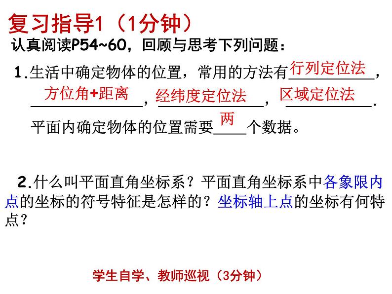 回顾与思考1第三章 位置与坐标复习目标(1分钟)2、熟练掌握平面直角坐标系内的点在每一象限内和坐标轴上点的特征。 1、了解在平面内,确定一个物体的位置 需要两个数据。3、在平面直角坐标系中,点的坐标与点到坐标轴或到原点的距离之间的关系。4、巩固轴对称与坐标变化间的关系,会熟练的求坐标系中对称点的坐标。复习指导1(1分钟)学生自学、教师巡视(3分钟) 认真阅读P54~60,回顾与思考下列问题: 1.生活中确定物体的位置,常用的方法有 , , , . 平面内确定物体的位置需要 个数据。 2.什么叫平面直角坐标系?平面直角坐标系中各象限内点的坐标的符号特征是怎样的?坐标轴上点的坐标有何特点? 行列定位法方位角+距离经纬度定位法区域定位法两更正、点拨(3分钟)注意:第一象限第二象限第三象限第四象限(+,+)(-,+)(-,-)(+,-)x轴上的点的纵坐标为0,表示为(x,0)y轴上的点的横坐标为0,表示为(0,y)原点的坐标为(0,0)1.象限内点的符号特征和数轴上 的点的坐标特征如图所示:复习检测1(8分钟)2、如图,A、B、C是棋子在方格纸上摆出的三个位置,如果用(2,5)表示A的位置,B表示为 ,C表示为_______。(1,4)(3,4)1、A岛在B岛的南偏西31°距离240KM,则B岛在A岛的北偏东31°,距离240KM3、若 mn = 0,则点 P(m,n)必定在 上 .6、如果点(a,b)在第三象限,那么点(-3a+3,4b-4)在( )A、第一象限 B、第二象限C、第三象限 D、第四象限4、若点(3,a-2)在第四象限,则a的取值范围是 .5、已知点P(a-2,2a+1)在x轴上,则点P的坐标为 ;若点P在y轴上,则点P的坐标为 ;坐标轴Da<2(-2.5,0)(0,5)复习指导2(1分钟)学生自学、教师巡视(3分钟) 认真阅读P61~66,回顾与思考下列问题: 1.在平面直角坐标系中,点的坐标与点到坐标轴或到原点的距离有何关系?2.在平面直角坐标系中,平行于坐标轴的直线上点的坐标有何特征?3.在实际问题中,怎样建立适当的平面直角坐标系解决问题?更正、点拨(3分钟): 1.点的坐标与距离的关系是: P(a,b)到x轴的距离为———— 到y轴的距离为———— 到原点的距离为——————纵坐标的绝对值∣b∣横坐标的绝对值∣a∣“数形结合”思想oxyP( , )a b∣b∣∣a∣2.平行坐标轴的直线上的点的坐标特征平行于x轴的直线上的点的 ______ 相等;平行于y轴的直线上的点的 ______ 相等。纵坐标横坐标复习检测2(8分钟)1、已知点P(-3,2)则点P到x轴的距离为___,到y轴的距离为____,到原点的距离是 。234、△ABC中,AB=AC=5,BC=6,建立适当的直角坐标系,并写出点A、B、C的坐标;3、已知线段AB平行于x轴,若点A的坐标为(-2,3), 线段AB的长为5,则点B的坐标是 。(-7,3)或(3,3)则点A、B、C三个点的坐标分别为A(0,4)B(-3,0)C(3,0)2、已知点P(-1,a),且点P到x轴的距离为3,则点P的坐标为 。(-1,3)或(-1,-3)解:如图,以BC所在直线为X轴,以BC边上的高在直线为Y轴建立直角坐标系XYox复习指导3(1分钟) 认真阅读P65,回答下列问题:学生自学、教师巡视(3分钟)2.利用平面直角坐标系可以确定点的位置.未给出平面直角坐标系的情况下,可以先建立平面直角坐标系,选择的原点不同,建立的平面直角坐标系就________,得到的点的坐标也_________.3.如果知道两个点的坐标,先准确建立________,再根据给出的点的坐标找到点的______不同不同平面直角坐标系位置oyP(a,b)∣b∣∣a∣x1.坐标与距离复习检测1(9分钟)3. 长方形ABCD的长为5,宽为4,建立平面直角坐标系,使其中C的坐标为(-2.5,2),写出其它各个顶点的坐标.1、已知点P在第二象限,且到x轴的距离是2,到y轴的距离是5,则P点的坐标为 . 2、以点M(0,3)为圆心,5为半径的圆与x轴交点的坐标为 .4、如图,点A的坐标为(6,6)点B的坐标为(8,2),求△AOB的面积。 (-5,2)(4,0)和(-4,0)(-5,-2)、(5,2)、(5,-2)易漏解3. 长方形ABCD的长为5,宽为4,建立平面直角坐标系,使其中C的坐标为(-2.5,2),写出其它各个顶点的坐标.解:如图,以长方形对边中点的连线所在的直线分别为x轴和y轴,以其交点为原点建立平面直角坐标系,则A(2.5,-2),B( 2.5,2),D(-2.5,-2)易错点:长方形顶点字母易标错.答案唯一吗?易漏:坐标系各要素:箭头、x、y4、如图,点A的坐标为(6,6)点B的坐标为(8,2),求△AOB的面积。 解:如图所示=18因此:△AOB的面积为18数学思想:化不规则为规则CEDS△AOB=S四边形CDEO-S△AOC-S△ ADB-S△BOE1、关于y轴对称的点的坐标,______相同,_______互为相反数,即:点(x,y)关于y轴对称点的坐标是______(-x,y)纵坐标横坐标2、关于x轴对称的点的坐标,______相同,_______互为相反数,即:点(x,y)关于x轴对称点的坐标是______(x,-y)纵坐标横坐标3、关于原点对称的点的坐标,横坐标__________,纵坐标__________,即:点(x,y)关于原点对称的点的坐标是______(-x,-y)互为相反数互为相反数复习指导4(1分钟)学生自学、教师巡视(3分钟)复习检测2(10分钟)(1,-2)(-1,2)(-1,-2)3、若点A(m,-5)与点B(2,n)关于x轴对称,则m= ,n= 。4、小明将点M关于x轴的对称点误认为是关于y轴的对称点,得到点(-4,-3),则点M关于x轴的对称点是 . 25(4,3)1、如图,平面直角坐标系中,AB是过点(1,0)且垂直于x轴的平面镜,则点P(3,2)在平面镜AB中的像的坐标为( ) A.(-3,2) B.(1,2)C.(0,2) D.(-1,2) D5、“怪兽吃豆豆”是一种计算机游戏,如图3的标志表示“怪兽”先后经过的几个位置,如果用(0,0)表示“怪兽”的第一个位置,用(7,8)表示“怪兽”的第九个位置,那么用同样的方式表示“怪兽”按图中箭头所指路线经过的第三个位置是 ,第六个位置是 . 6、如图4,作△ABC关于y轴的轴对称图形,那么所得图形△A′B′C′的顶点