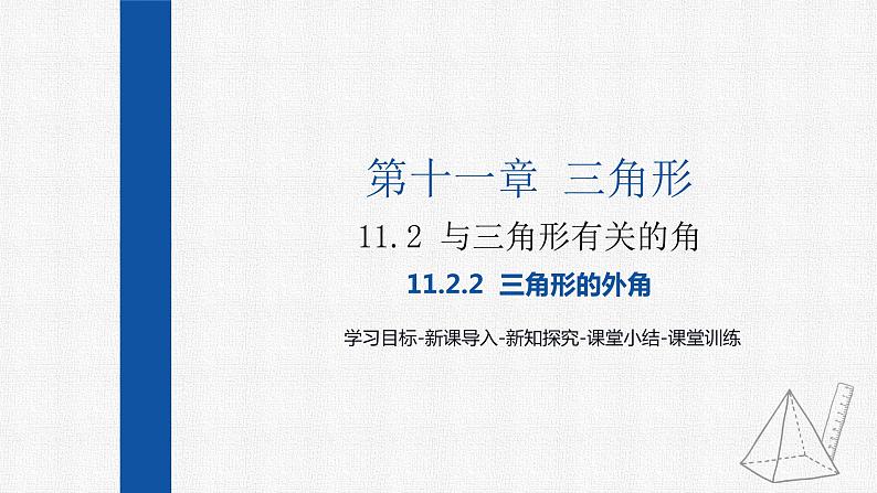 这是一份初中数学人教版八年级上册11.2.2 三角形的外角多媒体教学ppt课件,共9页。PPT课件主要包含了教学目标,重点难点,教学设计等内容,欢迎下载使用。