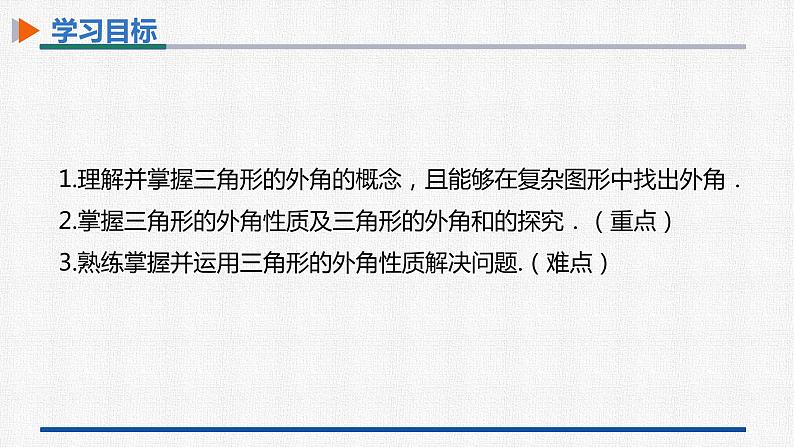 1.理解并掌握三角形的外角的概念,且能够在复杂图形中找出外角.2.掌握三角形的外角性质及三角形的外角和的探究.(重点)3.熟练掌握并运用三角形的外角性质解决问题.(难点)