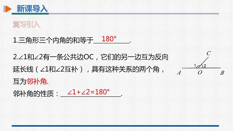 2.∠1和∠2有一条公共边OC,它们的另一边互为反向延长线(∠1和∠2互补),具有这种关系的两个角,互为邻补角.邻补角的性质: .