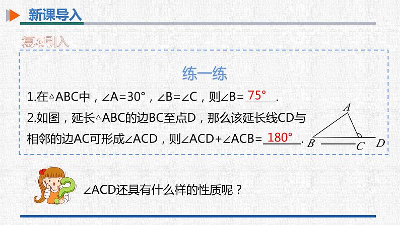 练一练1.在△ABC中,∠A=30°,∠B=∠C,则∠B= .2.如图,延长△ABC的边BC至点D,那么该延长线CD与相邻的边AC可形成∠ACD,则∠ACD+∠ACB= .