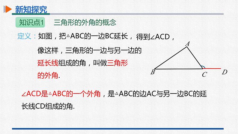 ∠ACD是△ABC的一个外角,是△ABC的边AC与另一边BC的延长线CD组成的角.
