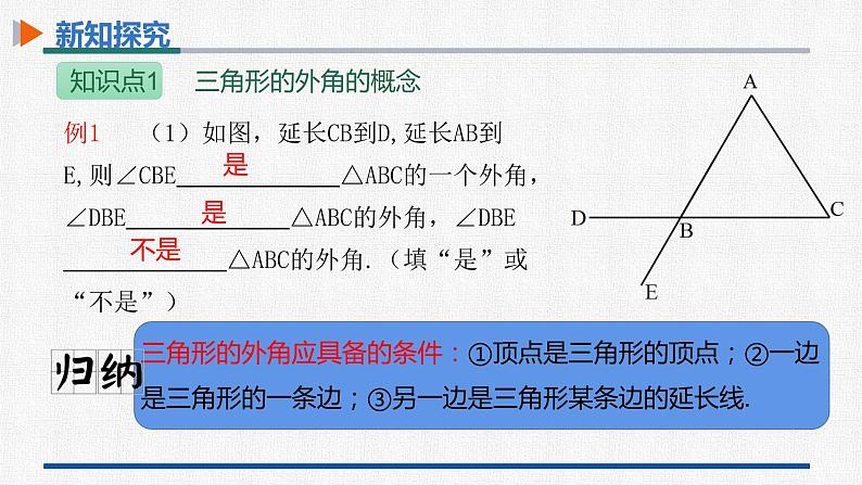例1 (1)如图,延长CB到D,延长AB到E,则∠CBE △ABC的一个外角,∠DBE △ABC的外角,∠DBE △ABC的外角.(填“是”或“不是”)