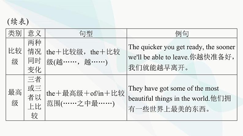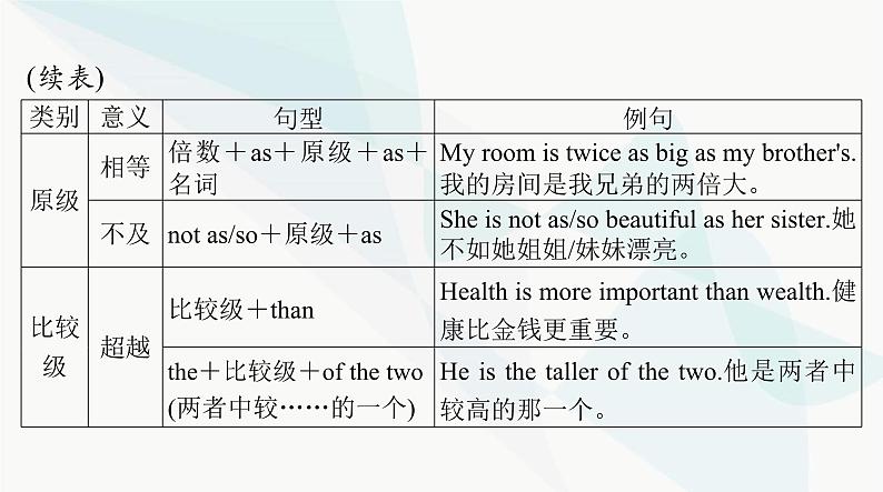 这是一份2024届高考英语一轮总复习第二部分第四讲形容词和副词课件,共13页。PPT课件主要包含了比较结构的修饰语,倍数表达法等内容,欢迎下载使用。