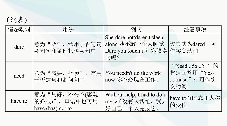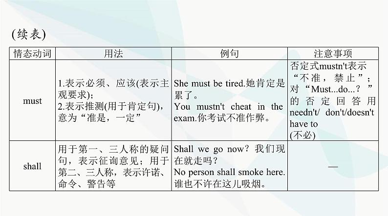 这是一份2023届高考英语二轮复习情态动词和虚拟语气课件,共60页。PPT课件主要包含了考点精讲,一 情态动词,难点释疑,can’t ,mustn’t ,needn’t ,解题策略,易错聚焦,达标检测,can 等内容,欢迎下载使用。
