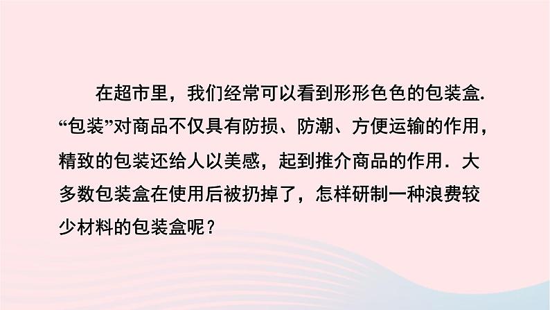 在超市里,我们经常可以看到形形色色的包装盒. “包装”对商品不仅具有防损、防潮、方便运输的作用,精致的包装还给人以美感,起到推介商品的作用.大多数包装盒在使用后被扔掉了,怎样研制一种浪费较少材料的包装盒呢?
