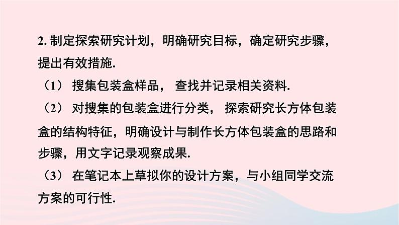 2. 制定探索研究计划,明确研究目标,确定研究步骤,提出有效措施.(1) 搜集包装盒样品, 查找并记录相关资料.(2) 对搜集的包装盒进行分类, 探索研究长方体包装盒的结构特征,明确设计与制作长方体包装盒的思路和步骤,用文字记录观察成果.(3) 在笔记本上草拟你的设计方案,与小组同学交流方案的可行性.