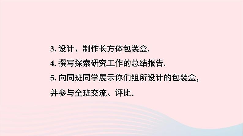 3. 设计、制作长方体包装盒.4. 撰写探索研究工作的总结报告.5. 向同班同学展示你们组所设计的包装盒, 并参与全班交流、评比.