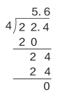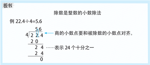 师问:这个24又表示什么呢?生讨论后回答:24表示24个十分之一。师:用24个十分之一除以4,每份应该是多少呢?生:每份是6个十分之一。师:怎样在商上面表示6个十分之一呢?生:在6的前面点上小数点。师:商的小数点一定要和被除数的小数点对齐。教师随学生的回答板书: