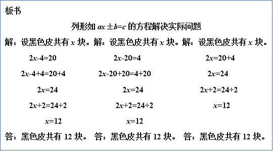 师:对照线段图,我们来看看刚才同学们找出的等量关系是否符合题意。教师引导学生对照分析,发现同学们找出的等量关系都符合题意。(2)根据等量关系列方程。师:应该设谁为x?生:因为黑色皮块数是未知的,所以应该设黑色皮共有x块。师:请同学们根据自己找出的等量关系列出方程,完成解答过程。学生独立完成,交流汇报。生1:我根据“黑色皮块数×2-4=白色皮块数”列方程。解:设黑色皮共有x块。2x-4=202x-4+4=20+42x=242x÷2=24÷2x=12 答:黑色皮共有12块。生2:我根据“黑色皮块数×2-白色皮块数=4”列方程。解:设黑色皮共有x块。2x-20=42x-20+20=4+202x=242x÷2=24÷2x=12 答:黑色皮共有12块。生3:我根据“黑色皮块数×2=白色皮块数+4”列方程。解:设黑色皮共有x块。2x=20+42x=242x÷2=24÷2x=12 答:黑色皮共有12块。教师根据学生回答适当板书。师:请同学们自己检验。学生检验并交流方法。师:比较这三个方程的解法,你发现了什么相同之处?生:发现它们都是转化为2x=24后再解。3. 教师小结。像上面这种形式的方程,我们可以把2x看作一个整体,先求出2x等于多少,再求出x等于多少。核心点总结 列方程解决实际问题的步骤:(1)找出未知数,用字母x表示;(2)分析实际问题中的数量关系,找出等量关系,列方程;(3)解方程并检验、作答。三、当堂练习1. 课件出示教材练习十六第5题。2. 课件出示题目。设计意图 通过不同形式的练习,让学生利用已学知识解决实际问题,提高学生解决问题的能力。四、课堂总结师:这节课你学会了什么?学生汇报。(课件出示)解形如ax±b=c的方程,先把ax看作一个整体,求出ax等于多少,再求x等于多少。五、课后作业请完成教材练习十六第6、7、8、9题。六、板书设计