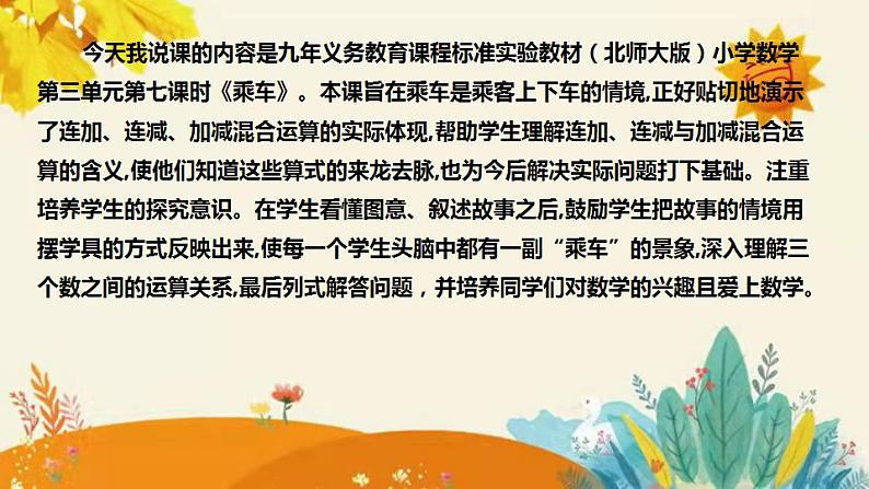 【新】北师大版小学数学一年上册第三单元第八课《乘车》说课稿附反思含板书及课堂练习和答案课件PPT