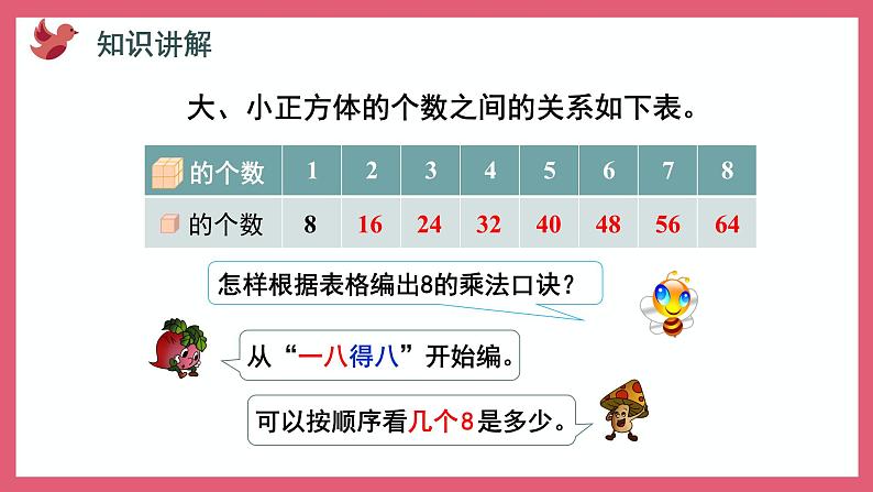 8的乘法口诀中,每相邻两句口诀的积都相差8,除最后一句口诀,每个口诀都对应两道乘法算式。