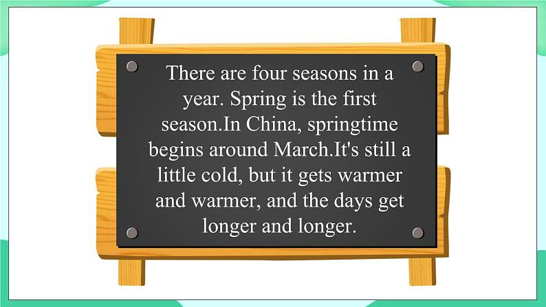 There are fur seasns in a year. Spring is the first seasn.In China, springtime begins arund March.It's still a little cld, but it gets warmer and warmer, and the days get lnger and lnger.