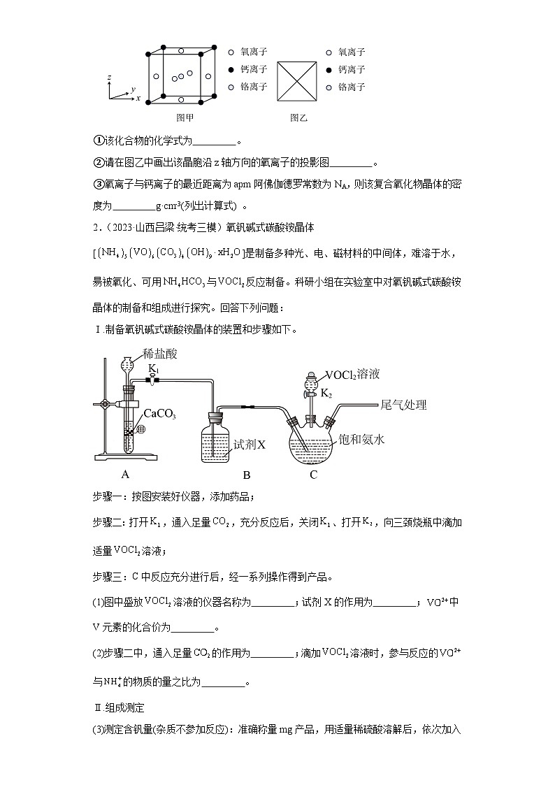 2.(2023·山西吕梁·统考三模)氧钒碱式碳酸铵晶体 []是制备多种光、电、磁材料的中间体,难溶于水,昜被氧化、可用与反应制备。科研小组在实验室中对氧钒碱式碳酸铵晶体的制备和组成进行探究。回答下列问题: