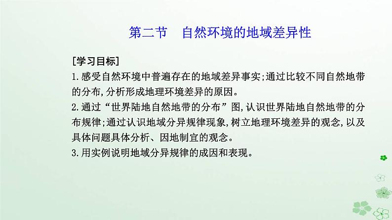 [学习目标]1.感受自然环境中普遍存在的地域差异事实;通过比较不同自然地带的分布,分析形成地理环境差异的原因。2.通过“世界陆地自然地带的分布”图,认识世界陆地自然地带的分布规律;通过认识地域分异规律现象,树立地理环境差异的观念,以及具体问题具体分析、因地制宜的观念。3.用实例说明地域分异规律的成因和表现。