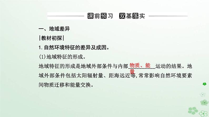 一、地域差异|教材初探|1.自然环境特征的差异及成因。(1)地域特征的形成。地域特征的形成是地域外部条件与内部 运动的结果。地域外部条件包括太阳辐射量、距海远近等,常常影响自然环境要素间物质迁移和能量交换。