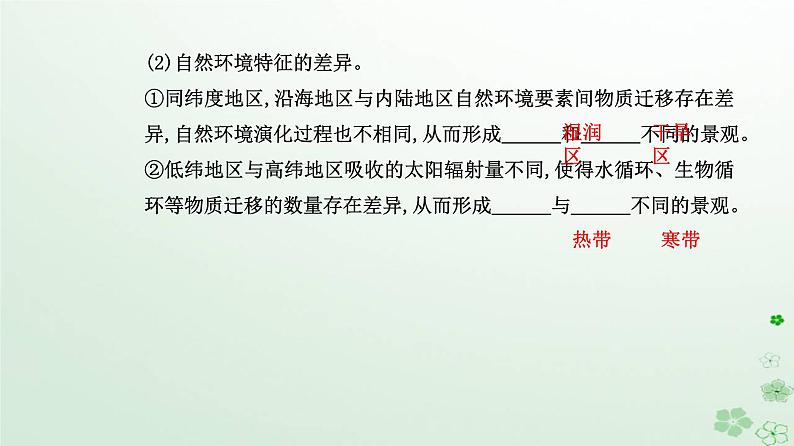 (2)自然环境特征的差异。①同纬度地区,沿海地区与内陆地区自然环境要素间物质迁移存在差异,自然环境演化过程也不相同,从而形成 和 不同的景观。②低纬地区与高纬地区吸收的太阳辐射量不同,使得水循环、生物循环等物质迁移的数量存在差异,从而形成 与 不同的景观。