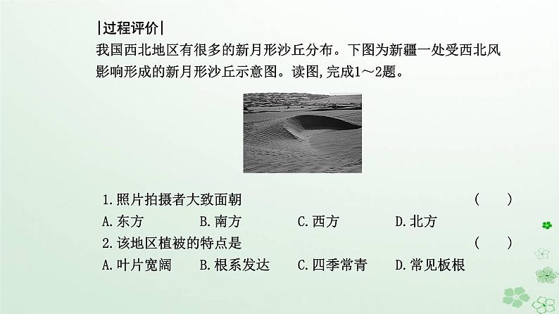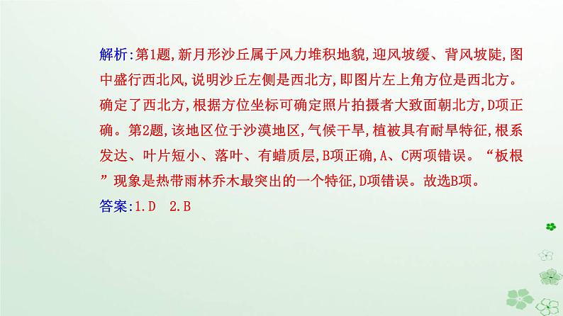 解析:第1题,新月形沙丘属于风力堆积地貌,迎风坡缓、背风坡陡,图中盛行西北风,说明沙丘左侧是西北方,即图片左上角方位是西北方。确定了西北方,根据方位坐标可确定照片拍摄者大致面朝北方,D项正确。第2题,该地区位于沙漠地区,气候干旱,植被具有耐旱特征,根系发达、叶片短小、落叶、有蜡质层,B项正确,A、C两项错误。“板根”现象是热带雨林乔木最突出的一个特征,D项错误。故选B项。答案:1.D 2.B