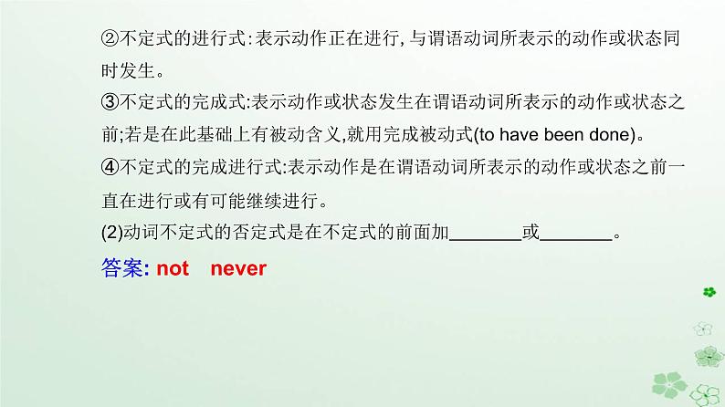 ②不定式的进行式:表示动作正在进行,与谓语动词所表示的动作或状态同时发生。③不定式的完成式:表示动作或状态发生在谓语动词所表示的动作或状态之前;若是在此基础上有被动含义,就用完成被动式(t have been dne)。④不定式的完成进行式:表示动作是在谓语动词所表示的动作或状态之前一直在进行或有可能继续进行。(2)动词不定式的否定式是在不定式的前面加 或 。 答案: nt never