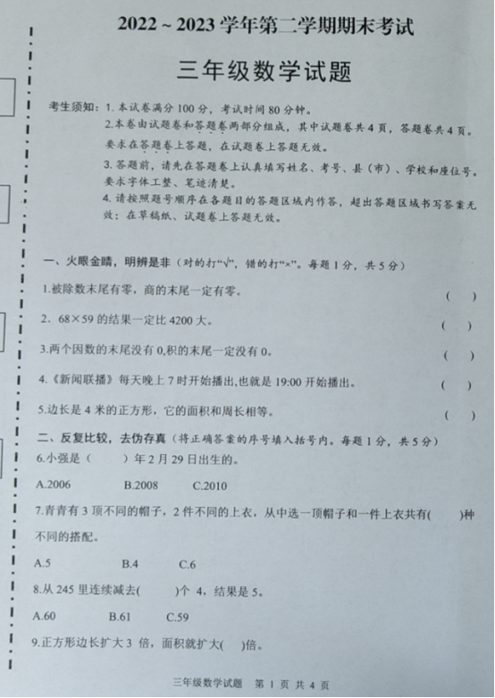 这是一份新疆维吾尔自治区喀什地区2022-2023学年三年级下学期期末考试数学试题,共5页。