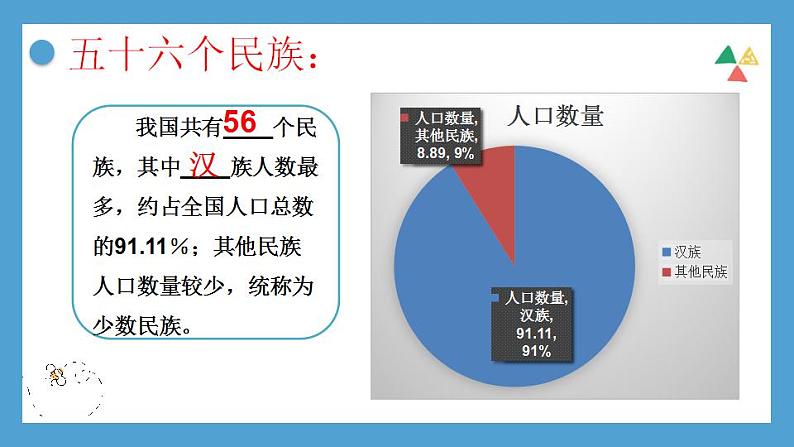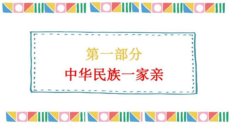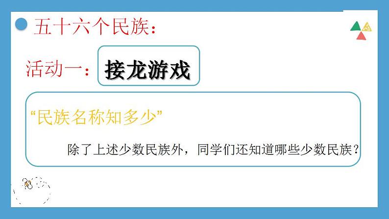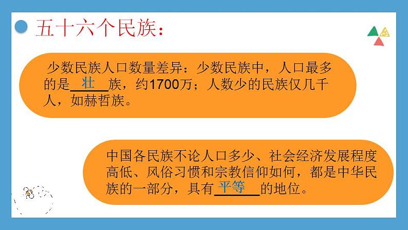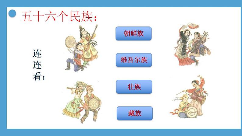 展开湘教版八年级上册第一章第四节中国的民族导入新课:知道我国是一个团结统一的多民族大家庭,共有56个民族,理解我国的民族政策,树立正确的民族观。阅读相关资料,了解各少数民族的民族风情。(重点)运用中国民族分布图,说出我国的民族分布特征。(重难点)学习目标第一部分中华民族一家亲连连看:7月8月五十六个民族:朝鲜族维吾尔族壮族藏族活动一:接龙游戏“民族名称知多少” 除了上述少数民族外,同学们还知道哪些少数民族?五十六个民族: 我国共有____个民族,其中____族人数最多,约占全国人口总数的91.11%;其他民族人口数量较少,统称为少数民族。56汉五十六个民族: 少数民族人口数量差异:少数民族中,人口最多的是_____族,约1700万;人数少的民族仅几千人,如赫哲族。中国各民族不论人口多少、社会经济发展程度高低、风俗习惯和宗教信仰如何,都是中华民族的一部分,具有______的地位。壮平等五十六个民族:第二部分同心共筑中国梦中国的民族分布“大散居”“小聚居”“交错杂居”中国的民族分布桂、滇宁、甘、新新黑、吉、辽内蒙古藏、青、川湘、贵滇、川、黔、桂活动二:中国的民族分布“大散居”“小聚居”“交错杂居”中西北东西南北东北西南东南汉族:中部、东部少数民族:东北满、朝鲜等少数民族:西北回、维吾尔、蒙古等少数民族:西南藏、苗、傣等中国的民族分布读下面两幅图,讨论:我国的少数民族的分布都有哪些因素有关?第三部分多彩民族风 各小组展示课前收集的有关民俗风情材料。(节日、民族文字、饮食、服饰等)独特的民族风情活动三:节日云南傣族泼水节蒙古族那达慕大会汉族龙舟节彝族火把节民族文字饮食驴打滚烤羊肉竹筒饭服饰白族傣族景颇族 近年来,中国许多地方都发挥特色文化优势,开展丰富多彩的旅游活动。在湖南汨罗江畔,每年端午节前后举办盛大的“汩罗江国际龙舟节”,参赛者在汨罗江上划龙舟竞渡。在江苏周庄,众多演员参与江南水乡的实景演出,为游人演绎苏南古镇的民俗文化。据此完成下列任务。活动四: 1、 收集资料,谈一谈端午节的起源,说一说家乡端午节的习俗。 端午节在每年农历五月初五。起源说法不一,大都认为是悼念投汨罗江自沉的战国时楚国爱国诗人屈原;有认为是古越人举行的龙图腾祭俗;也有认为是由夏、商、周时的夏至节演变而来等。于时,人们插艾蒲、吃粽子、饮雄黄酒和在小儿衣襟上系香袋等,以期禳灾疫,去虫毒。2、关于利用地方特色文化发展旅游业,玲玲和贝贝有不同的看法。你赞成谁的观点?除此之外,你还有哪些看法?玲玲和贝贝的看法都有道理。利用地方特色文化发展旅游业能促进就业,带动当地经济的发展,有利于提高当地居民的生活水平,但是过度开发会破坏当地的自然环境,也不利于当地特色文化的保护和传承。因此我们应该以辩证的观点看待这一问题。 可以促进地方特色文化的发展,带动地方经济的振兴。 会破坏当地的自然环境,也不利于地方特色文化的保护。3、结合家乡情况,举例说明地方特色文化对发展旅游业的影响。拓展延伸内蒙古、青海、甘肃 西藏、青海、四川 新疆贵州、湖南、云南、广西广西黑龙江、吉林、辽宁 湖南、贵州、广西 云南台湾那达慕大会雪顿节、锅庄舞手鼓舞苗年、芦笙节三月三歌节长鼓舞、跳板、荡秋千风雨桥泼水节、孔雀舞丰收节7月8月巩固练习:1. 我国少数民族中,人口数量最多的是( ) A.汉族 B.满族 C.蒙古族 D.壮族2.下列有关我国各民族分布特点的叙述,不正确的是( ) A.汉族主要分布在东部和中部地区 B.各民族均匀分布 C.少数民族主要分布在西南、西北和东北部地区 D.各民族“大散居,小聚居,交错杂居”D B7月8月巩固练习:3.阅读材料,回答下列问题。材料一 中央电视台中文国际频道(CCTV-4)《远方的家》栏目推出的大型系列特别节目电视专题片《边疆行》,从广西按顺时针方向途经9个省级行政区域单位至辽宁沿途拍摄,反映了我国边疆的风土人情。7月8月巩固练习:(1)《边疆行》路线按顺时针方向经过的少数民族聚居区依次是①广西壮族自治区、②_____自治区、③ __________ 自治区、④ _______自治区。(2)《边疆行》的终点位于辽宁省,该省的主要少数民族是满族和_____族。(3)③省区的主要少数民族是__ _____族。(4)赛牦牛、摔跤分别是图中_____和_____两个少数民族聚居区的传统比赛项目。(填序号)西藏新疆维吾尔内蒙古朝鲜维吾尔 ② ④7月8月趣味作业: 收集中国各民族的民俗风情资料,举行一次以“多彩民族风”为主题的联欢会。要求参加表演的同学唱一首民族歌曲或跳一支民族舞蹈,并介绍这个民族的风俗习惯。THANKYOU