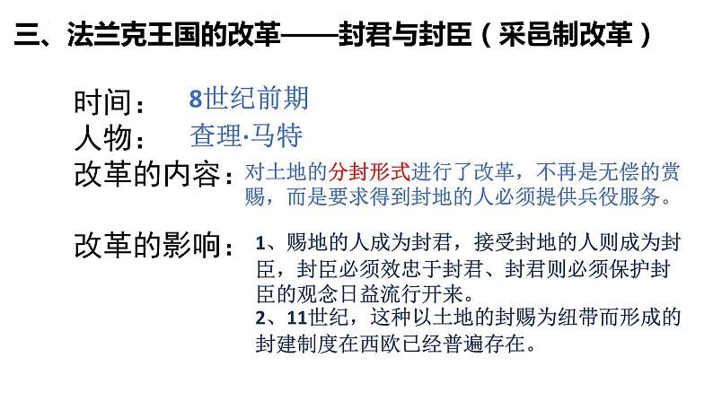 查理大帝亚历山大大帝凯撒大帝大卫王第7课 基督教的兴起和法兰克王国西欧主要国家的历史是从法兰克王国开始的基督教一、法兰克王国的信仰—基督教1.时间:2.地点:3.原因:4.创始人:5.教义:6.传播:1世纪罗马帝国统治下的巴勒斯坦地区耶稣4世纪末,罗马皇帝确定基督教为国教,促进了基督教的传播。犹太人长期遭受苦难,渴望“救世主”的到来。人民把希望 寄托宗教,寻求精神上的解脱。忍受苦难,死后可以升入“天堂”。西罗马帝国灰飞烟灭,西欧的历史和文化,由于蛮族的征服而发生变异——“蛮族”日耳曼人占领帝国政权保存,成为古希腊罗马文化的直接继承者中世纪:5世纪—15世纪末从西罗马帝国灭亡--文艺复兴 封建社会 二、法兰克王国的建立1.建立时间:2.地点:3.建立者:481年高卢地区克洛维(1)思想上措施:皈依基督教,承认罗马教会在欧洲的重要地位4、克洛维巩固统治的措施:(2)经济上措施:保留原来罗马大地主的土地,把国有土地和无主土地赐给教会和部下;结果:整个法兰克王国都信仰了基督教结果:版图扩大到高卢南部地区以及莱茵河以东至多瑙河之间的大部分地区(3)军事措施:不断扩张结果:取得了罗马教会、信基督教的高卢罗马人和部下的广泛支持三、法兰克王国的改革——封君与封臣(采邑制改革)时间:人物:改革的内容:改革的影响:8世纪前期查理·马特对土地的分封形式进行了改革,不再是无偿的赏赐,而是要求得到封地的人必须提供兵役服务。1、赐地的人成为封君,接受封地的人则成为封臣,封臣必须效忠于封君、封君则必须保护封臣的观念日益流行开来。2、11世纪,这种以土地的封赐为纽带而形成的封建制度在西欧已经普遍存在。改革前改革后无偿的赏赐有偿的封赏查理·马特请用最简洁的语言概述封君与封臣出现前后区别:封君与封臣关系的纽带是什么?土地的封赐 封臣(解下武器,脱帽,下跪,双手放在封君合拢的手掌之中):阁下,我是您的人了。 封臣(作发誓状):从现在起,我将像一个封臣对封君那样真诚无欺地效忠于您。 封君(拉起封臣,亲吻他的脸颊):我的封臣,我会尽我所能保护你。1、封君与封臣分别有怎样的义务?2、概括封君、封臣关系的特点。不能任意侵害封臣的荣誉、人身和财产安全;必须保护封臣 有着严格的等级性,权利和义务交织在一起,带有一定的契约意义。封建等级制度(国王)(公侯伯子男爵)(骑士)对封君忠诚、无偿服兵役、提供金钱等普天之下莫非王土,率土之滨莫非王臣。——《战国策》 我的附庸的附庸,不是我的附庸。——《查理·马特改革》西欧封建制西周分封制四、法兰克王国的发展—查理曼帝国时间:人物:措施:结果:8世纪前后查理1、查理四处征伐,800年前后法兰克王国的版图扩展,成为西欧最大的王国。2、查理鼓励基督教的发展,把“什一税”贡献给教会。3、800年的圣诞节,教皇在罗马为查理举行了加冕礼,称查理为“罗马人的皇帝”查理被称为“查理大帝”或“查理曼” ,法兰克王国被称为“查理曼帝国”查理曼帝国查理大帝查理曼帝国版图,与西罗马帝国欧洲部分基本相当,成为当时西欧最大的王国。查理加冕公元800年的圣诞节,教皇在罗马为查理举行了加冕礼,称其为“罗马人的皇帝”。他统治时期的法兰克王国,史称“查理曼帝国”。查理大帝或查理曼教皇给国王加冕说明什么问题?教权凌驾于王权之上五、查理曼帝国的衰亡:衰落时间:分裂时间:分裂结果:814年843年 帝国一分为三,成为以后德意志、法兰西和意大利三个国家的雏形,三个王国互不隶属。481年8世纪800年查理加冕843年法兰克王国建立查理继位帝国一分为三法兰克王国查理马特采邑改革1、法兰克王国的建立者是A.查理曼 B.丕平C.屋大维 D.克洛维2、下列有关西欧封建社会的表述,错误的是A.封建主与附庸之间的关系以血缘为纽带B.罗马教会的地位在法兰克王国时期得到提高C.封君对封臣也有义务D.存在严格的等级制度3、法兰克王国国王查理为鼓励基督教发展而征收的税是A.印花税 B.过桥税 C.人头税 D.什一税DAD4、小明同学在百度图库搜集历史资料时发现了右图,请你帮他判断该图反映的制度是A.印度种姓制度 B.西欧封建等级制度C.西周分封制度 D.秦朝中央集权制度 B查理曼帝国材料:6世纪,教会利用 《圣经》 中农牧产品的1/10“属于上帝”的说法,开始向基督教信徒征收此税。779年,法兰克国王查理大帝规定:缴纳什一税是每个法兰克王国居民的义务……(所征实物)分为大什一税 (粮食)、小什一税 (蔬菜、水果)、血什一税(牲畜) 等,税额往往超过纳税人收入的1/10,负担主要落在农民身上。1、结合所学知识,说一说查理大帝实行了鼓励什么宗教的政策?基督教2、根据材料,指出为鼓励该宗教发展查理大帝采取了什么措施?“什一税”3、结合所学知识,分析这一措施的影响?教会富有、势力强大查理曼得到教会的支持