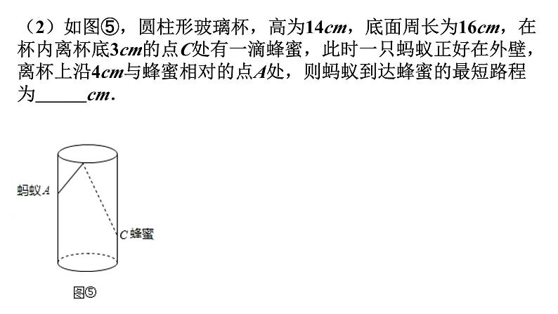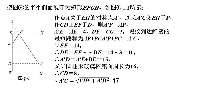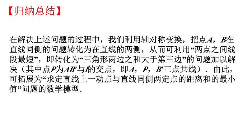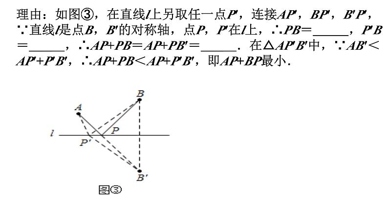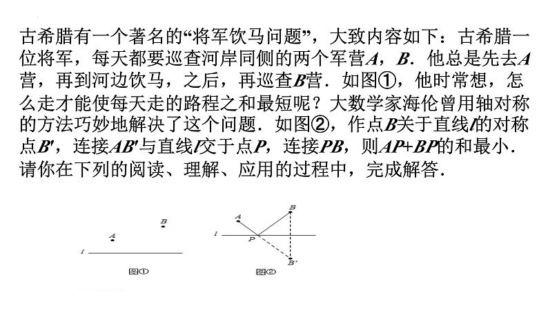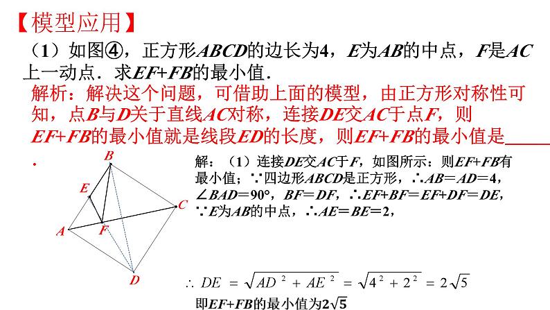 特殊四边形中最值问题将军饮马模型古希腊有一个著名的“将军饮马问题”,大致内容如下:古希腊一位将军,每天都要巡查河岸同侧的两个军营A,B.他总是先去A营,再到河边饮马,之后,再巡查B营.如图①,他时常想,怎么走才能使每天走的路程之和最短呢?大数学家海伦曾用轴对称的方法巧妙地解决了这个问题.如图②,作点B关于直线l的对称点B′,连接AB′与直线l交于点P,连接PB,则AP+BP的和最小.请你在下列的阅读、理解、应用的过程中,完成解答. 理由:如图③,在直线l上另取任一点P′,连接AP′,BP′,B′P′,∵直线l是点B,B′的对称轴,点P,P′在l上,∴PB= ,P′B= ,∴AP+PB=AP+PB′= .在△AP′B′中,∵AB′<AP′+P′B′,∴AP+PB<AP+P′B′,即AP+BP最小. 【归纳总结】在解决上述问题的过程中,我们利用轴对称变换,把点A,B在直线同侧的问题转化为在直线的两侧,从而可利用“两点之间线段最短”,即转化为“三角形两边之和大于第三边”的问题加以解决(其中点P为AB′与l的交点,即A,P,B′三点共线).由此,可拓展为“求定直线上一动点与直线同侧两定点的距离和的最小值”问题的数学模型. 【模型应用】(1)如图④,正方形ABCD的边长为4,E为AB的中点,F是AC上一动点.求EF+FB的最小值.解析:解决这个问题,可借助上面的模型,由正方形对称性可知,点B与D关于直线AC对称,连接DE交AC于点F,则EF+FB的最小值就是线段ED的长度,则EF+FB的最小值是 .(2)如图⑤,圆柱形玻璃杯,高为14cm,底面周长为16cm,在杯内离杯底3cm的点C处有一滴蜂蜜,此时一只蚂蚁正好在外壁,离杯上沿4cm与蜂蜜相对的点A处,则蚂蚁到达蜂蜜的最短路程为 cm.把图⑤的半个侧面展开为矩形EFGH,如图⑤﹣1所示: (3)如图⑥,在边长为2的菱形ABCD中,∠ABC=60°,将△ABD沿射线BD的方向平移,得到△A′B′D′,分别连接A′C,A′D,B′C,则A′C+B′C的最小值为 .∵在边长为2的菱形ABCD中,∠ABC=60°,∴AB=CD=2,∠ABD=30°,∵将△ABD沿射线BD的方向平移得到△A'B'D',∴A′B′=AB=2,A′B′∥AB,∵四边形ABCD是菱形,∴AB=CD=AD=2,AB∥CD,∴∠BAD=120°,∴A′B′=CD,A′B′∥CD,∴四边形A′B′CD是平行四边形,∴A′D=B′C,∴A'C+B'C的最小值=A′C+A′D的最小值,∵点A′在过点A且平行于BD的定直线l上,∴作点D关于定直线l的对称点E,连接CE交定直线l于A′,如图⑥所示: 【点评】本题是四边形综合题目,考查了轴对称﹣最短路线问题,正方形的性质,菱形的性质,矩形的判定和性质,勾股定理,平行四边形的判定与性质,含30°角的直角三角形的性质,圆柱的侧面展开图,等腰三角形的判定与性质,平移的性质等知识;本题综合性强,正确作出图形是解题的关键.斜大于直模型 1、如图,在△ABC中,∠BAC=30°,AB=AC=12,P为AB边上一动点,以PA,PC为边作平行四边形PAQC,求对角线PQ的长度的最小值.【分析】由平行四边形的性质可知O是PQ中点,PQ最短也就是PO最短,过O作AB的垂线OE,然后根据直角三角形的性质即可求出PQ的最小值.2、如图,矩形ABCD中,∠BOC=120°,BD=12,点P是AD边上一动点,求OP的最小值 3.如图,在边长为6的正方形ABCD中,点M为对角线BD上一动点,ME⊥BC于E,MF⊥CD于F,求EF的最小值 4、如图,在平行四边形ABCD中,∠C=120°,AD=4,AB=2,点H、G分别是边CD、BC上的动点.连接AH、HG,点E为AH的中点,点F为GH的中点,连接EF.求EF的最大值与最小值的差. 注意总结反思课后作业:练习纸