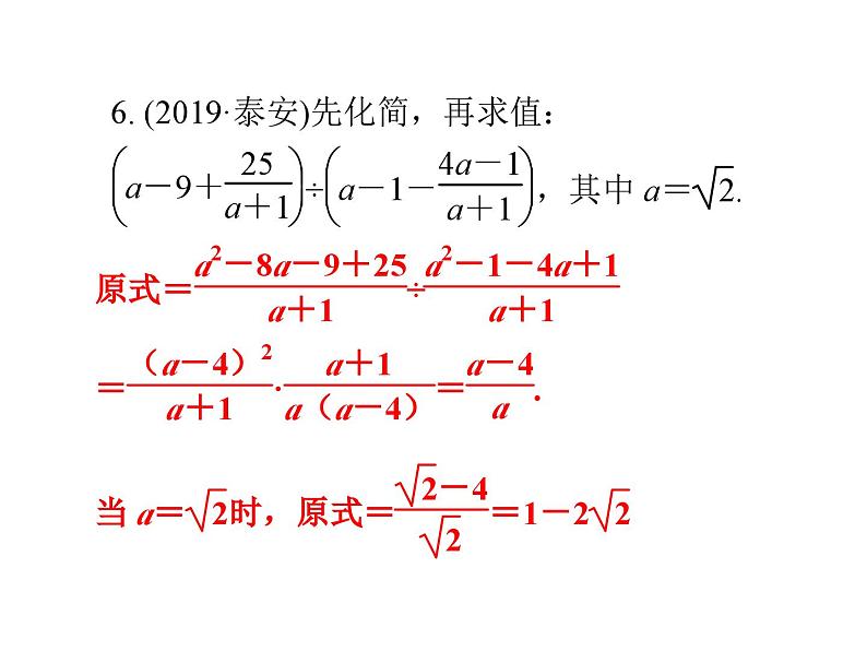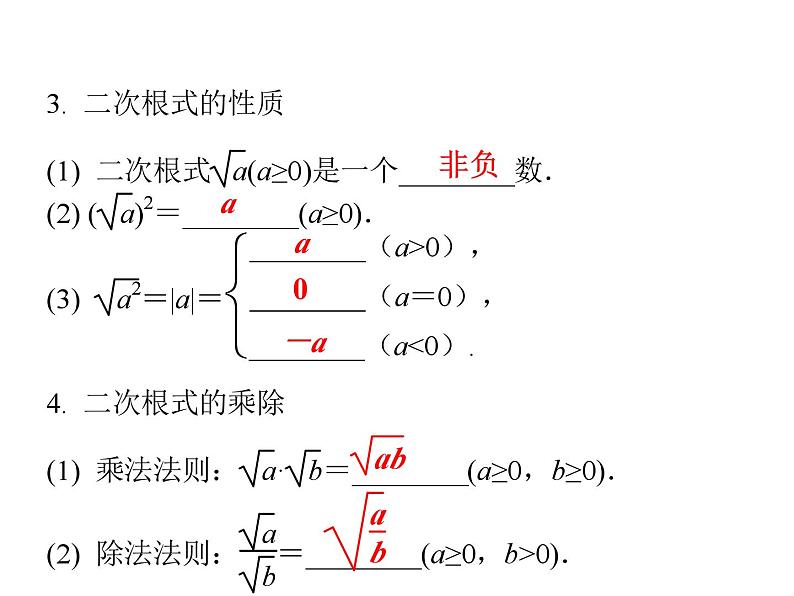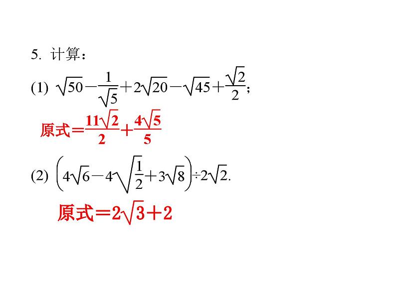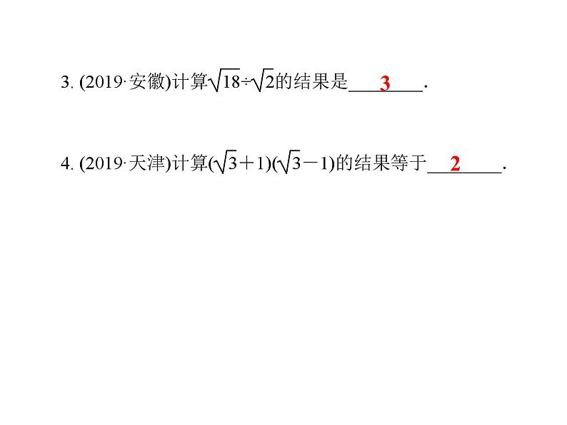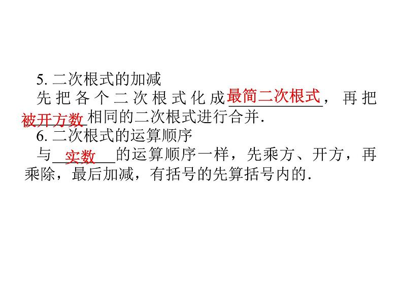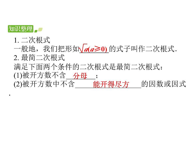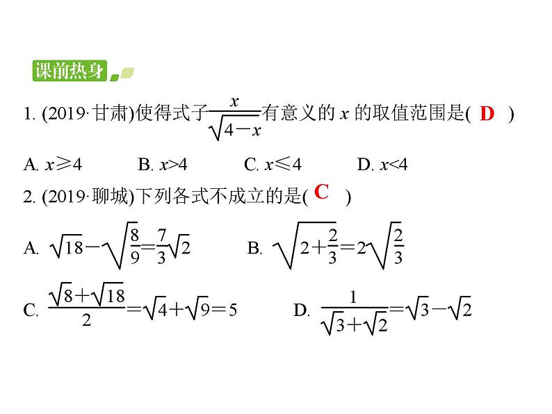 二次根式复习D C 3 2 1. 二次根式一般地,我们把形如________的式子叫作二次根式.2. 最简二次根式满足下面两个条件的二次根式是最简二次根式:(1)被开方数不含________;(2)被开方数中不含__________________的因数或因式. 分母 能开得尽方 非负 a a 0 -a 5. 二次根式的加减先把各个二次根式化成____________,再把________相同的二次根式进行合并.6. 二次根式的运算顺序与________的运算顺序一样,先乘方、开方,再乘除,最后加减,有括号的先算括号内的. 最简二次根式 被开方数 实数 二次根式有意义的条件 A x>8 跟踪训练 D B 最简二次根式 B 跟踪训练 D B 整式的有关运算 D 2 跟踪训练 D B二次根式的运算 跟踪训练 D 二次根式在分式运算中的应用 跟踪训练 二次根式的估算